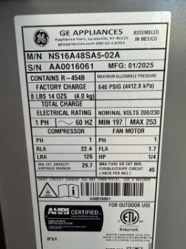 AIR CONDITIONER (NEW SHOWROOM DISPLAY MODEL). MODEL: NS16A48SA5002A MODEL: NS16A48SA5, TYPE: SPLIT SYSTEM AIR CONDITIONER (SINGLE-STAGE), COOLING CAPACITY: 48,000 BTU (4 TON), EFFICIENCY: 16 SEER2REFRIGERANT: R-454B, SOUND LEVEL: 78 DB (SEE PHOTOS FOR DETAILS)