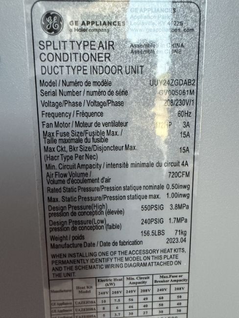 UNIT (NEW SHOWROOM DISPLAY). MODEL NO: UUY24ZGDAB2 VOLTAGE PHASE 230/230V FREQUENCY 60HZ FAN MOTOR 1/2 HP MAX FUSE 15A MAX CKT BKR SIZE 15A MIN CIRCUIT CAPACITY 4A (SEE PHOTOS FOR DETAILS)