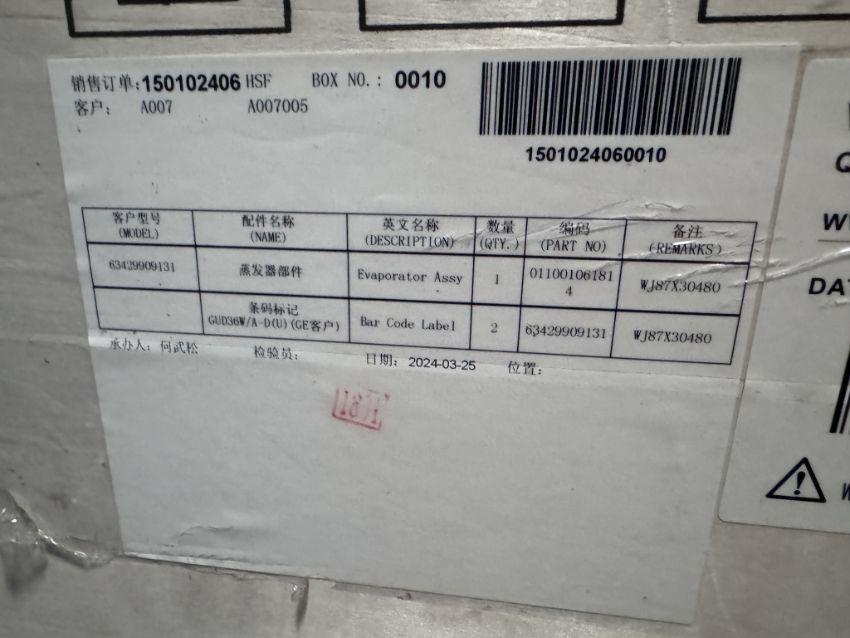 MODEL NO: WJ87X30480 EVAPORATOR ASSEMBLY (SEE PHOTOS FOR DETAILS)