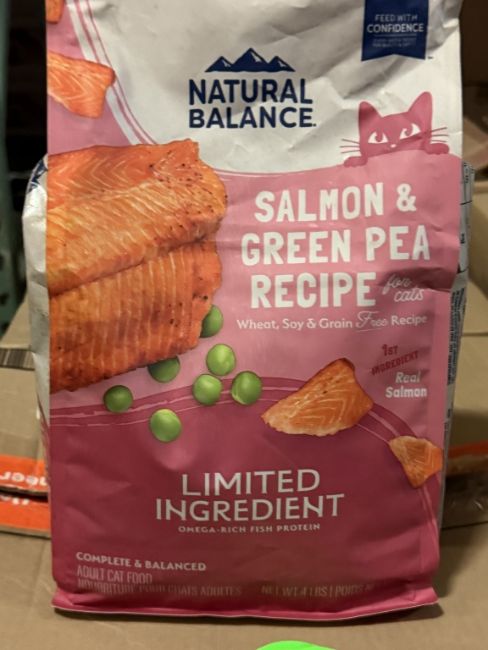 (38 +/-) BAGS OF NATURAL BALANCE SALMON & GREEN PEA RECIPE ADULT CAT FOOD 4 LB. EACH BEST BY DATE: 11/30/2025 (SEE PHOTOS FOR DETAILS)
