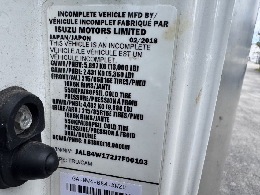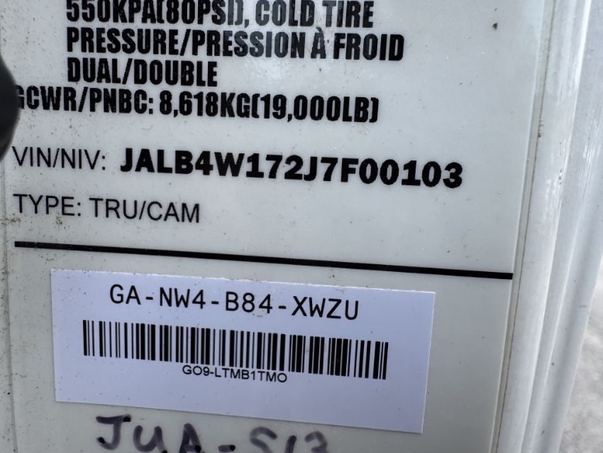 VIN: JALB4W172J7F00103 BODY: 2 DOOR CAB OVER, ENGINE: 3.0L I4 DI DIESEL ODOMETER READING: 74,954, KNAPHEIDE DRY VAN ALUMINUM BOX SIZE 16 FT BY 8 FT, LIFT GATE TESTED AND WORKING, RUNS AS IT SHOULD, COLD A/C, 7 KEYS, WERNER 40 FT ALUMINUM LADDER INCLUDED, SIDE MOUNTED LADDER RACK, OVERALL GOOD CONDITION, (TITLE ON HAND) PLEASE NOTE: THE CONTENTS OF EQUIPMENT AND SUPPLIES IN THIS BOX TRUCK ARE NOT INCLUDED IN THIS LOT. THE CONTENTS WILL BE SOLD IN THE NEXT LOT (LOT 10A) (SEE PHOTOS FOR DETAILS)