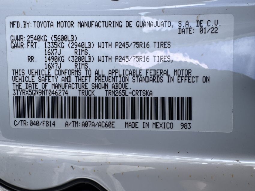 VIN: 3TYRX5GN9NT046274, BODY: 4 DOOR EXTENDED CAB, ENGINE: 2.7L I4 SMPI GASOLINE, ODOMETER READING: 92,132 RUNS AND DRIVES AS IT SHOULD, COLD A/C, 1 KEY, BACKUP CAMERA, WEATHER TECH FLOOR MATS, WEATHER GUARD TRUCK RACK AND DEEZEE ALUMINUM TRUCK TOOL BOX INCLUDED, GOOD OVERALL CONDITION, (TITLE DELAY 30 TO 45 DAYS, LIEN WILL BE PAID-OFF AFTER THE SALE, LENDER WILL SUPPLY FREE AND CLEAR TITLE TO WINNING BIDDER AS SOON AS AVAILABLE) (SEE PHOTOS FOR DETAILS)