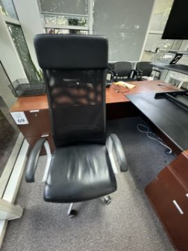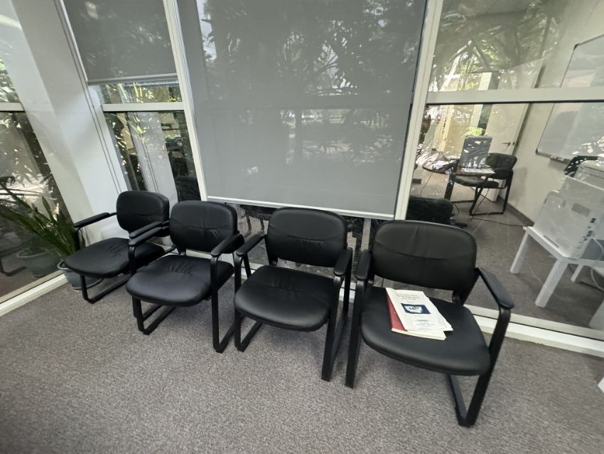 (1) OFFICE L-SHAPE DESK, (1) HIGH BACK OFFICE ROLLING CHAIR, (5) CLIENT CHAIR, DRY ERASE BOARD , (1) ROUND TABLE