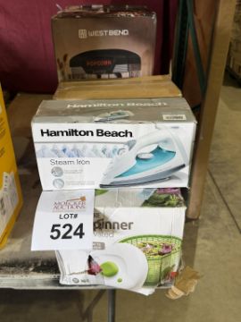 HAMILTON BEACH STEAM IRON, FARBERWARE SALAD SPINNER, BONSAII PAPER SHREDDER, AND WESTBEND POPCORN MAKER (NOTE MARKED AS DAMAGE OR FOR PARTS & PIECES) (SEE PHOTOS FOR DETAILS)