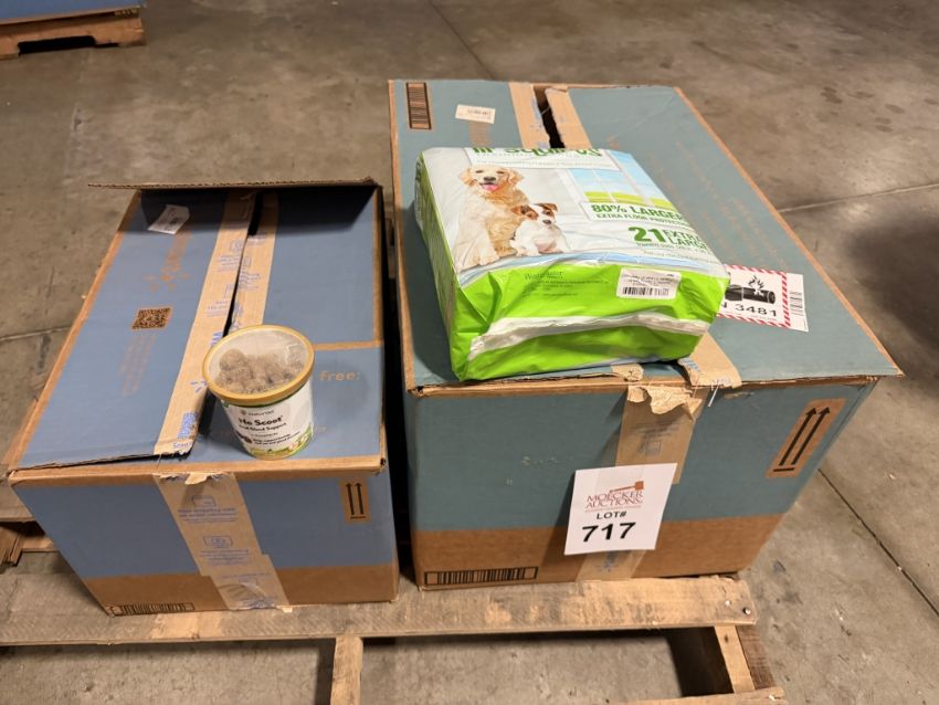 (18 +/-) OF ASSORTED PET SUPPLIES CONSISTING OF (8) LIL SQUIRTS TRAINING PADS EXTRA LARGE AND (10) OF NATURVET NO SCOOT ANAL GLAND SUPPORT (PUMPKIN) 60 SOFT CHEWS (NOTE: QUANTITY IS NOT GUARANTEED) (SEE PHOTOS FOR DETAILS)