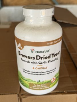 (252 +/-) BOTTLES OF NATURVET BREWERS DRIED YEAST FORMULA WITH GARLIC FLAVORING + OMEGAS FOR DOGS & CATS (1000 CHEWABLE TABS EACH) BEST BY DATE: 01/2028 (SEE PHOTOS FOR DETAILS)